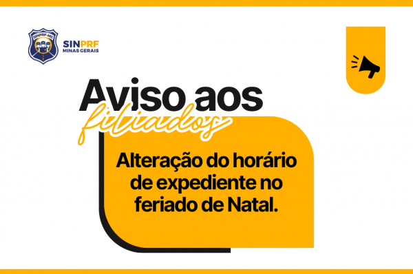 Leia MaisInformamos que, em razão das celebrações de Natal, o expediente do SINPRF-MG terá o horário de atendimento alterado
